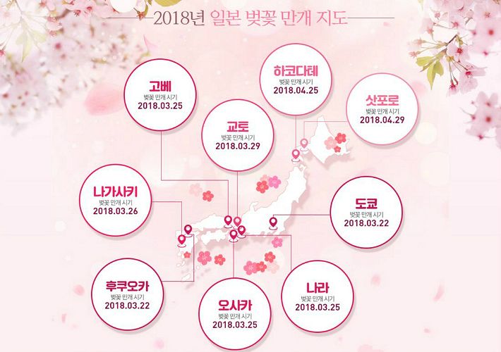 ◇ 벚꽃이 활짝 피는 시기는?일본 역시 지역에 따라 벚꽃의 개화 시기는 각기 다르다. 올 봄 벚꽃이 가장 이르게 만개할 것으로 예상되는 지역은 후쿠오카와 도쿄(3월22일)다. 이후 3월25일에는 나라와 오사카, 그리고 고베 지역이, 일본 내에서도 북쪽에 위치한 하코다테와 삿포로 지역은 4월25일과 29일에 벚꽃이 만개할 전망이다.