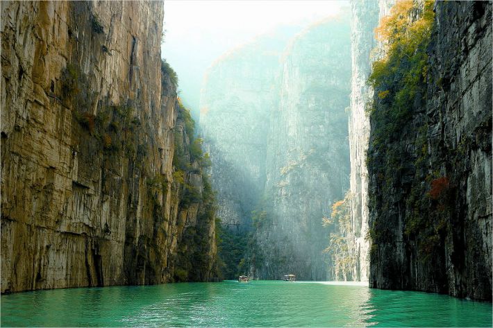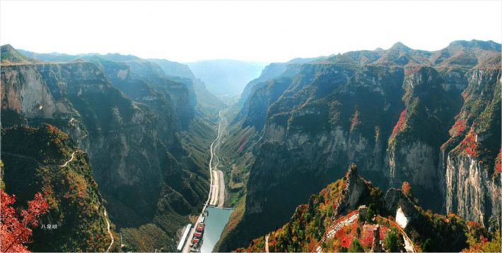 ◇ 팔천협(八泉峽)팔천협은 태항산 대협곡 내 5대 관광지 중 하나로 가장 웅장한 풍경과 아름다운 협곡을 자랑하는 곳이다. 깎아지를 듯 솟은 협곡들 사이로 잔잔히 흐르는 에메랄드 빛 물결을 헤치며 나아가는 유람선과 병풍처럼 펼쳐진 기암절벽들을 보고 있노라면 살아 움직이는 듯한 생동감을 느낄 수 있다.