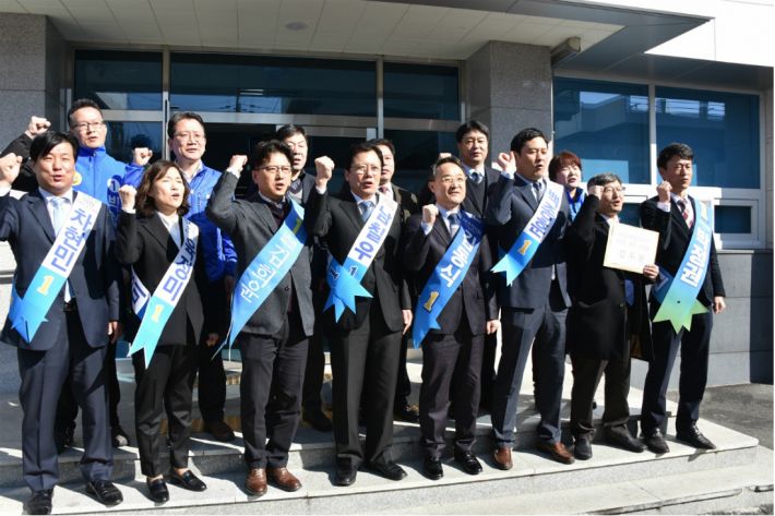 더불어민주당 소속 수성구지역 지방선거 출마 예정자들이 2일 단체로 예비후보 등록을 한 뒤 필승을 다짐하고 있다. (사진=남칠우 수성구청장 예비후보 제공)
