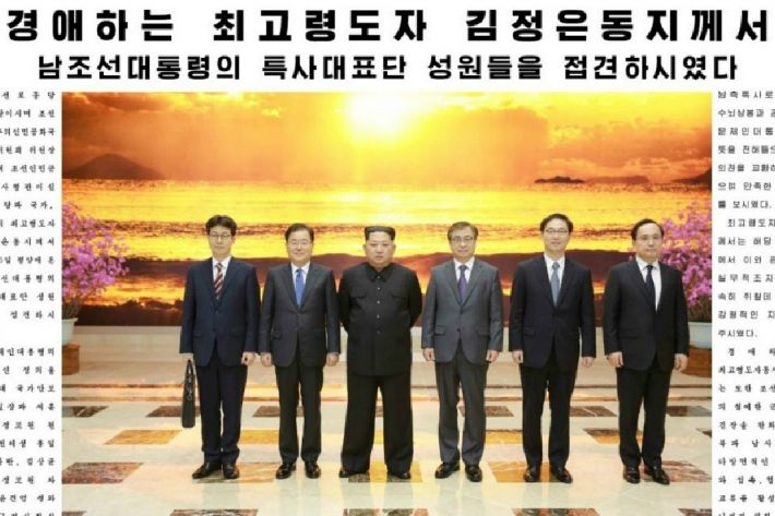 조선중앙통신은 6일 "김정은 동지께서 남조선 대통령의 특사대표단 성원들을 접견했다"며 수석특사인 정의용 청와대 국가안보실장이 문재인 대통령의 친서를 전달한 사실도 함께 보도했다.