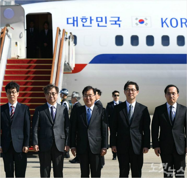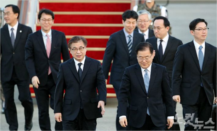문재인 대통령의 대북 특별사절단이 지난 5일 오후 경기도 성남 서울공항에서 평양행 특별기에 오르기 전 인사를 하고 있다. 왼쪽부터 윤건영 청와대 국정상황실장, 서훈 국정원장, 정의용 청와대 국가안보실장, 천해성 통일부 차관, 김상균 국정원 2차장. (사진=자료사진)