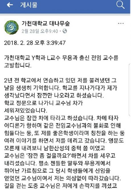 지난달 28일 페이스북 커뮤니티 '가천대학교 대나무숲'에는 Y학과 L교수의 성추행을 고발하는 글이 올라왔다.