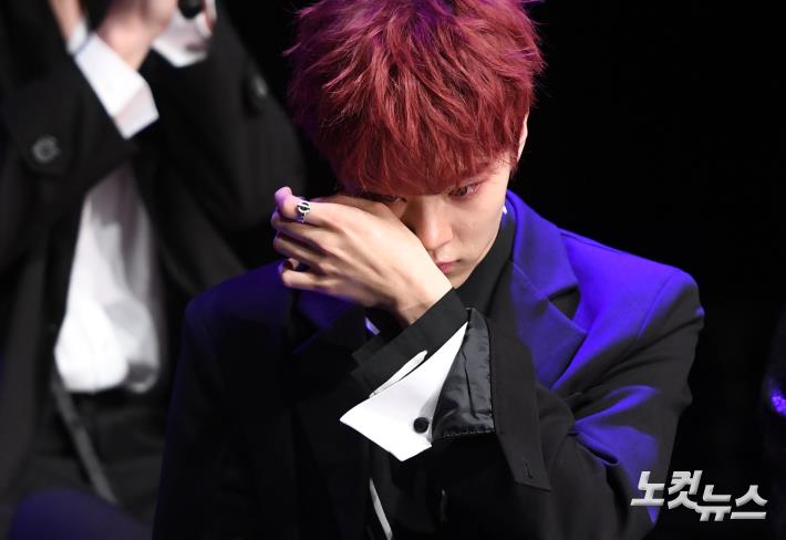 가수 업텐션 우신이 16일 오후 서울 강남구 일지아트홀에서 열린 첫 번째 정규 앨범 ‘INVITATION’ 쇼케이스에 눈물을 흘리고 있다.