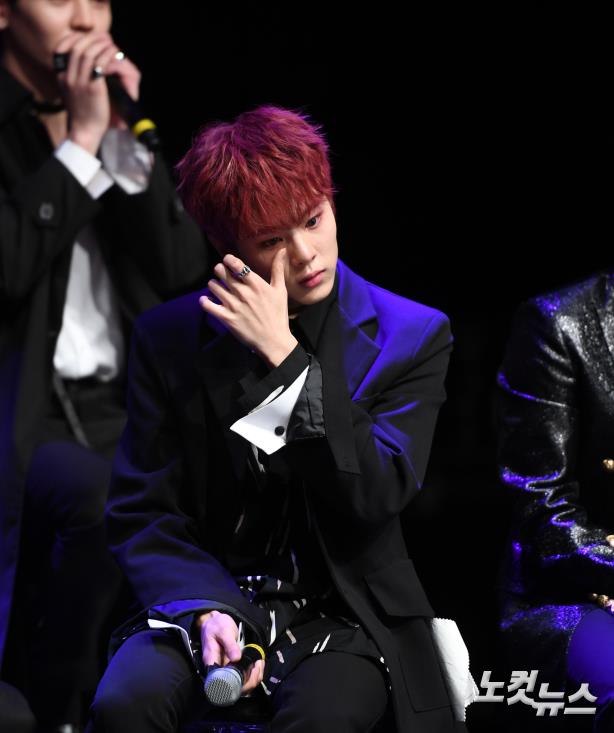 가수 업텐션 우신이 16일 오후 서울 강남구 일지아트홀에서 열린 첫 번째 정규 앨범 ‘INVITATION’ 쇼케이스에서 눈물을 흘리고 있다.