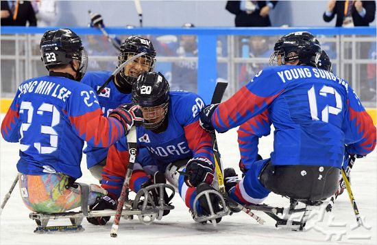 한국 장애인 아이스하키는 2018 평창 동계패럴림픽에서 이탈리아를 꺾고 동메달을 가져오며 동계 패럴림픽 출전 역사상 첫 메달을 수확했다.(사진=노컷뉴스)한국은 장동신, 정승환, 조영재, 이해만의 골로 4-1로 숙적 일본을 넘어 준결승 진출에 유리한 고지를 차지했다. 황진환기자