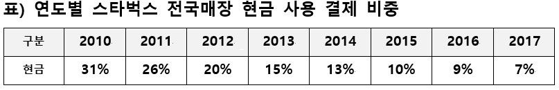 국내 스타벅스 매장에서 2010년도 31%에 달했던 현금 결제 비율은 2017년도에 7%까지 줄어들었다. 현금 외에 신용카드와 같은 다른 결제수단의 이용은 2017년 말 80% 수준의 사용률을 보이고 있다.