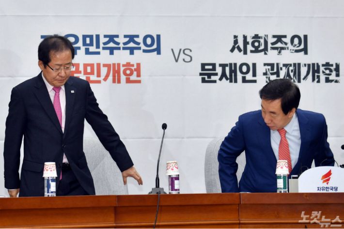 자유한국당 홍준표 대표와 김성태 원내대표가 26일 오전 국회에서 열린 확대원내대책회의에 참석하고 있다. (사진=윤창원 기자)