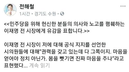 전 의원도 이날 자신의 페이스북에 '민주당을 위해 헌신한 분들의 의사와 노고를 폄훼하는 이재명 전 시장에게 유감을 표한다'는 제목의 글을 올렸다.
