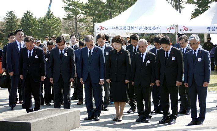 이날 4.3희생자 추념식에는 민주당 추미애 대표, 자유한국당 홍준표 대표, 바른미래당 박주선 공동대표, 민주평화당 조배숙 대표, 정의당 이정미 대표 등 여야 당 대표와 강창일.위성곤, 오영훈 국회의원 등이 참석해 유족들의 아픔을 달랬다.