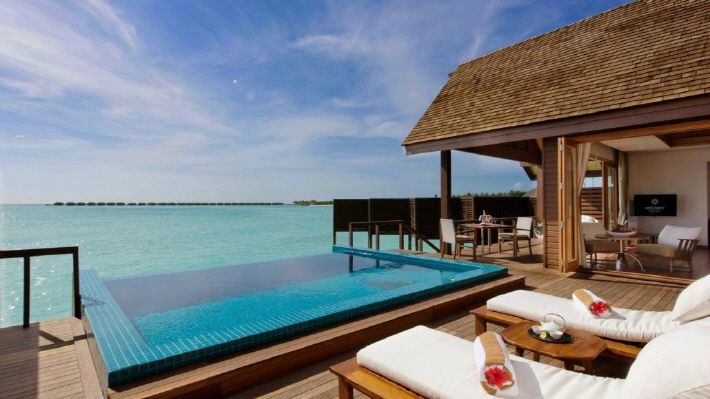널찍한 인피니티 프라이빗 풀과 야외 데크를 갖추고 있어 아름다운 몰디브 바다를 언제든지 감상할 수 있다. (사진=허니문리조트 제공)