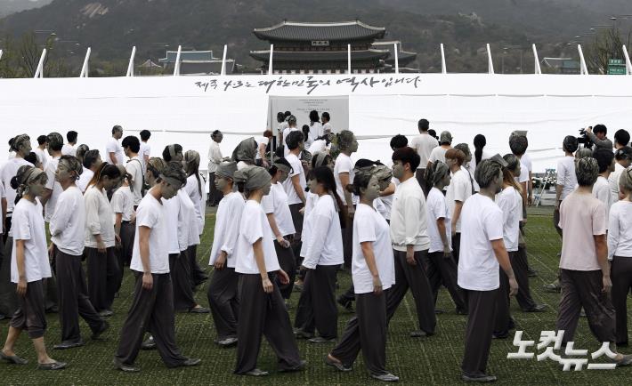 제주 4.3 70주기인 3일 오후 서울 광화문광장에서 4.3 희생자들의 모습을 한 시민 403명이 넋을 기리는 ‘4.3 대한민국을 외치다’ 퍼포먼스를 진행하고 있다.