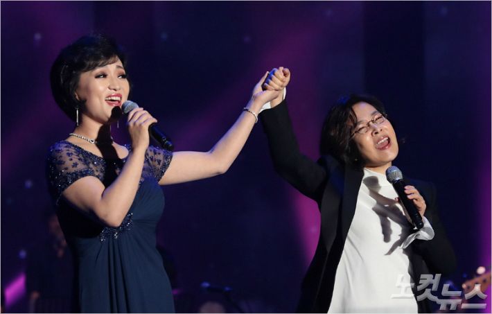 ◇ 이선희와 최진희, 16년 만에 다시 온 北이선희는 이날 북측 가수 김옥주와 함께 자신의 유명곡 'J에게'를 열창했다. 이선희의 맑은 목소리와 김옥주의 트로트 창법이 환상적인 하모니를 이뤘다.
