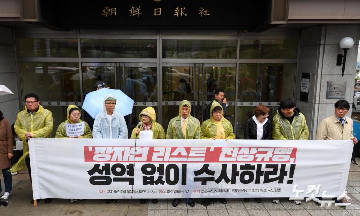 미투운동시민행동 등 시민단체 회원들이 5일 서울 조선일보 앞에서 장자연 리스트 진상규명을 촉구하는 기자회견을 하고 있다.