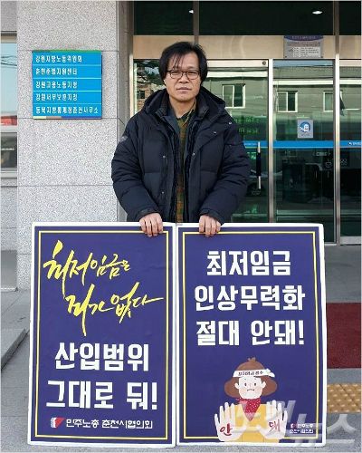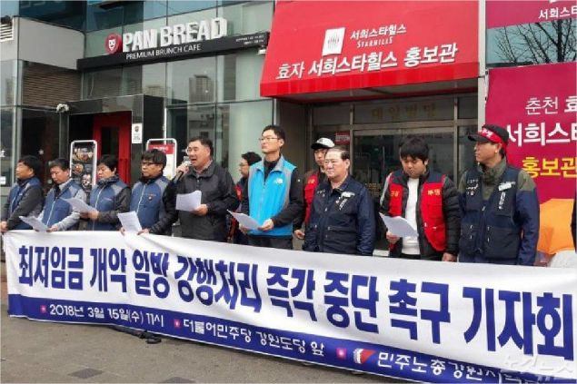 3월15일,전국민주노총 강원지역본부가 기자회견을 갖고 최저임금 개악 일방 강행처리 즉각 중단을 촉구했다.(사진=민주노총 강원본부 제공)