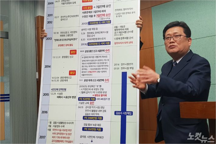 이 예비후보 캠프 김재정 조직본부장은 12일 오전 10시 전북도의회에서 기자회견을 열어 "기자들이 주목해야할 사항은 그 목사님께서 '내가 한마디 하면 김승수 시장(예비후보)은 한방에 간다고 했다'는 것, 그게 팩트다"며 이같이 밝혔다.