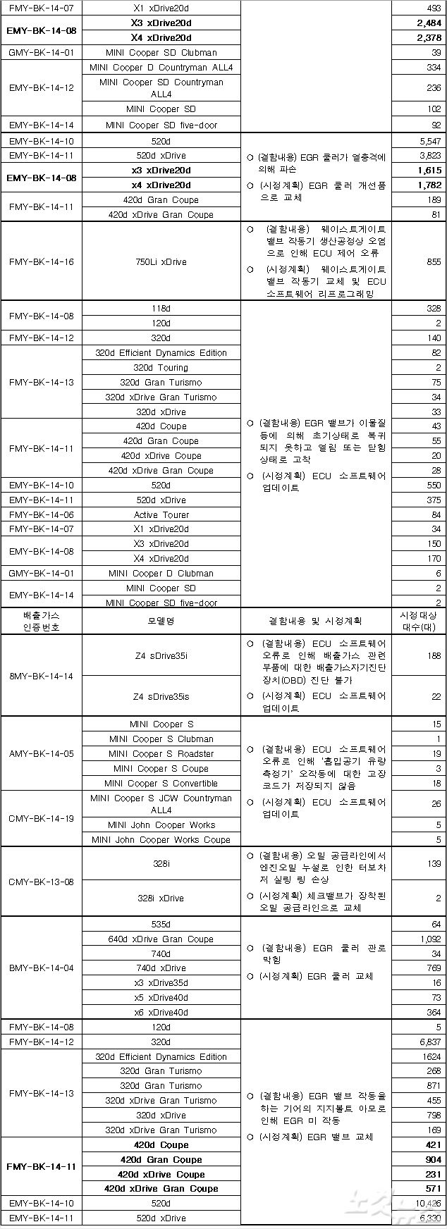 리콜 대상 가운데 BMW 420d 쿠페 차종은 EGR 밸브 작동을 위한 기어의 지지 볼트가 마모되면서 EGR이 정상 작동하지 않는 결함이 확인돼 개선품으로 교체된다.