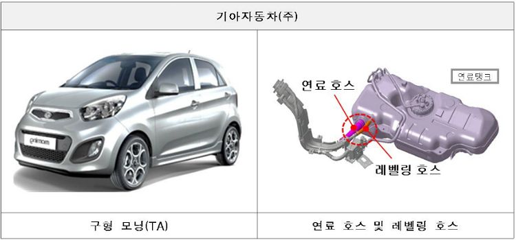 기아의 모닝(TA) 등 2개 차종 19만 562대는 연료와 레벨링 호스의 재질 결함으로 호스가 균열돼 누유가 발생, 화재를 불러올 가능성이 있는 것으로 확인됐다.