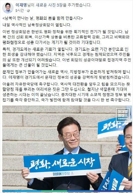 더불어민주당 이재명 경기지사 후보가 내일 열리는 남북정상회담의 성공을 기원했습니다.