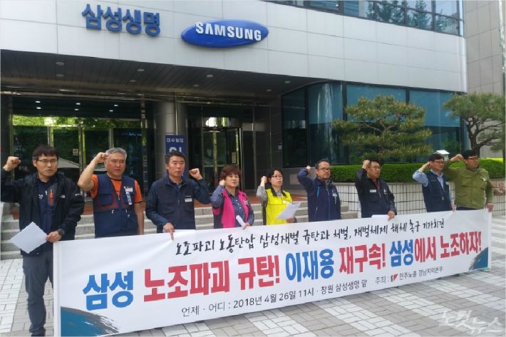 전국민주노동조합총연맹 경남본부는 26일 창원 성산구 삼성생명 창원지점 앞에서 "삼성 노조파괴 규탄, 이재용 재구속, 삼성에서 노조하자"는 제목의 기자회견을 열고 "삼성 이재용 회장이 삼성의 무노조 경영 폐기를 공식 선언하라"고 요구했다.