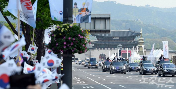 문재인 대통령이 남북정상회담일인 27일 오전 서울 광화문광장을 지나 판문점으로 향하고 있다. (사진=황진환 기자)