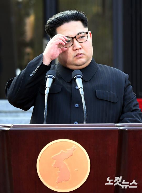 27일 오후 김정은 국무위원장이 판문점 평화의 집 앞마당에서 남북공동선언인 '판문점 선언' 발표를 위해 기다리고 있다.