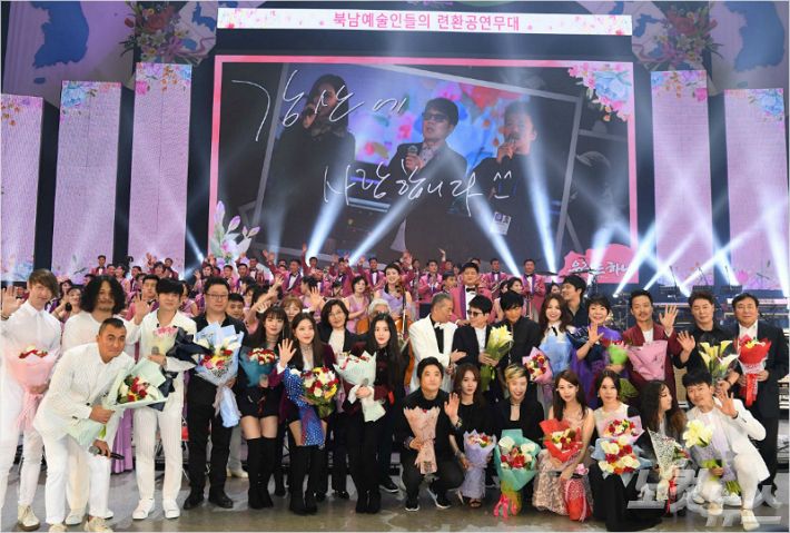 3일 평양 류경정주영체육관엣 열린 남북예술인의 연합무대 '우리는 하나' 공연 후 출연진이 기념촬영 하고 있다. (사진=평양공연 사진공동취재단)