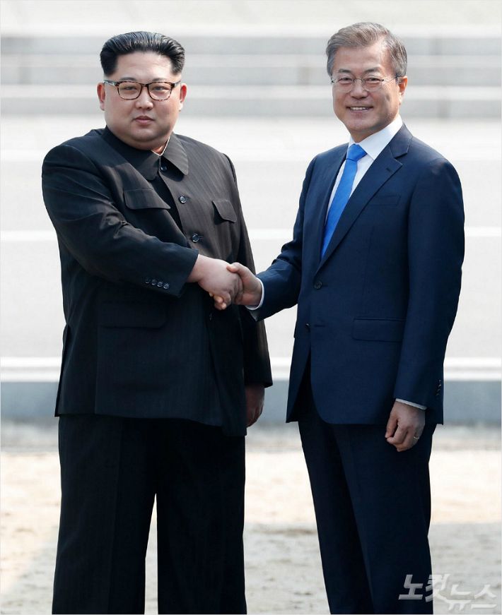 문재인 대통령과 김정은 국무위원장이 27일 오전 판문점에서 만나 인사하고 있다. (사진=박종민 기자/노컷뉴스)