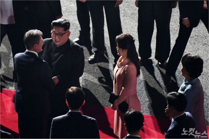 두 정상은 3층 연회장에서 승강기를 타고 1층 로비로 내려왔다. 배경음악으로 서태지의 '발해를 꿈꾸며'가 흘러나왔다. 문 대통령과 김 위원장이 각자 김정숙 여사와 리설주 여사의 손을 맞잡고 레드카펫을 걸었다.