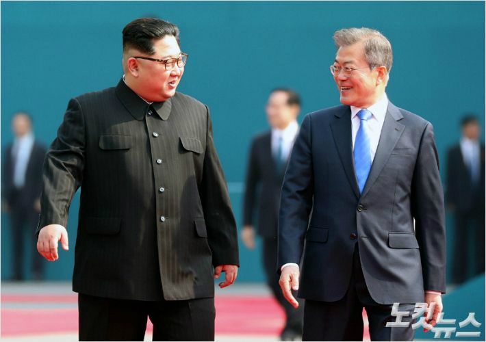 문재인 대통령과 김정은 국무위원장이 27일 오전 판문점 평화의집앞에서 국군의장대 사열을 마친 후 정상회담장으로 이동하며 대화를 나누고 있다. (사진=한국공동사진기자단)