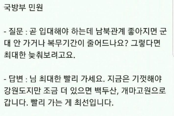 30일 소셜(SNS)미디어계정 한 이용자는 "이번 남북정상회담 후 올라왔다는 국방부 민원 답변의 센스. 이런 날이 빨리 오기를. 이게 실제 상황입니까"라는 글과 함께 사진 한장이 올라왔다.