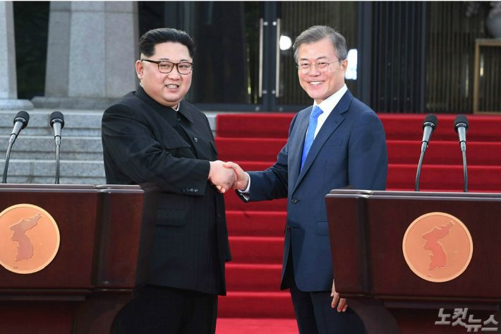 2018 남북정상회담이 열린 27일 경기도 파주시 판문점 평화의집 앞에서 문재인 대통령과 김정은 국무위원장이 '판문점 선언'을 발표한뒤 악수를 하고 있다. (사진=한국공동사진기자단)