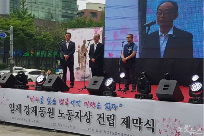 이어 "일제 식민지배로 고통받은 우리 민중의 한과 고통을 치유해야 한다"며 "오늘 강제징용 노동자상 제막식이 역사를 바로 세우는 밑거름이 되기를 희망한다"고 강조했다.