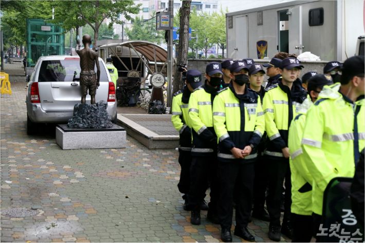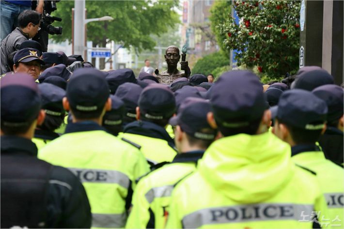 시민단체를 해산시킨 경찰은 노동자상 근처에 경력을 배치해 접근을 통제하고 있다.