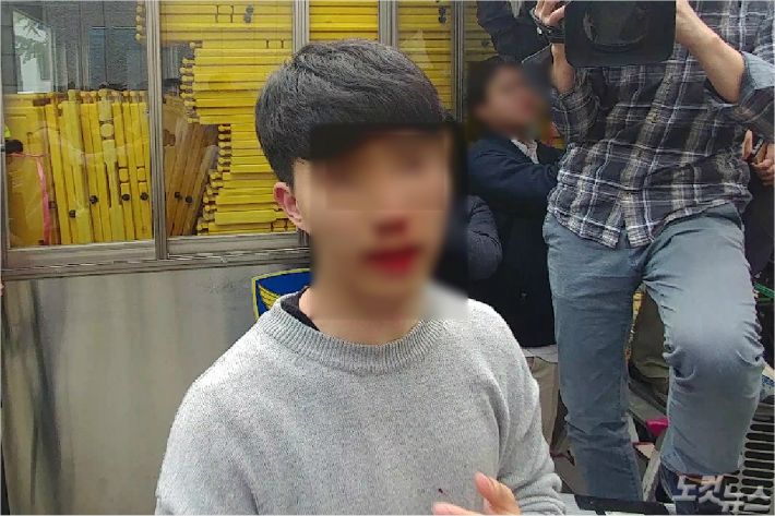 부산 강제징용노동자상 설치를 두고 시민사회단체와 경찰이 충돌한 지난 1일 한 시민이 경찰에 폭행 당했다고 주장하며 피를 흘리고 있다. (사진=송호재 기자)