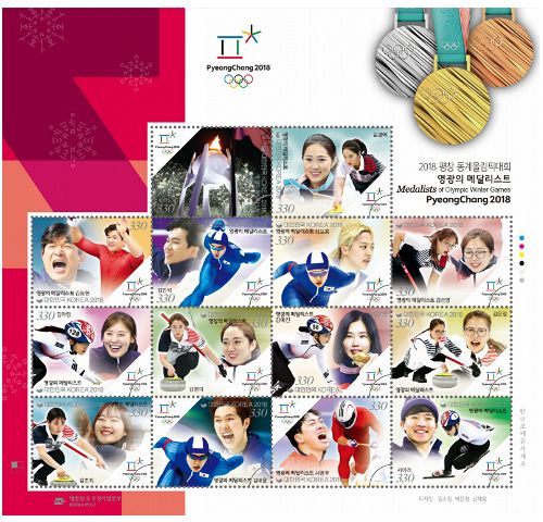 기념우표에는 '영미 신드롬'을 일으킨 여자컬링 대표팀과 남자 스켈레톤 금메달리스트 '아이언맨' 윤성빈 선수를 비롯해 쇼트트랙 임효준·최민정 선수, 스피드 스케이팅 이승훈·이상화 선수 등 메달리스트 26명의 경기 모습이 각각 담겼다.