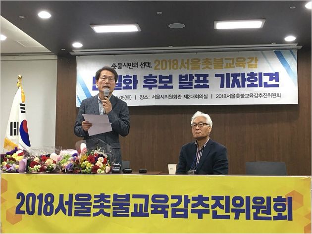 조희연 후보가 5일 서울 진보교육감 단일 후보로 확정되어 소감 발표를 하고 있다.(사진=김영태 기자)