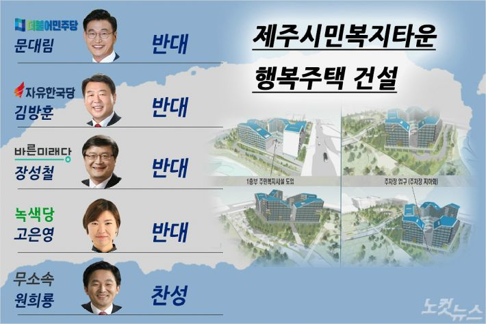 제주지사 선거 후보들의 '제주시민복지타운 내 행복주택건설'에 대한 입장. (그래픽=제주CBS)