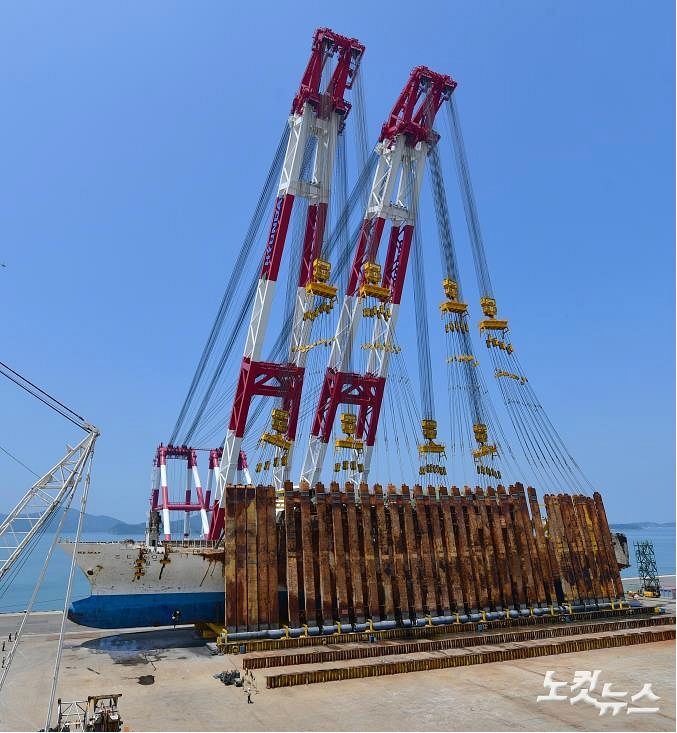 10일 전남 목포시 목포신항에서 세월호가 94.5도로 향해 세워지고 있다. (사진=박종민 기자)