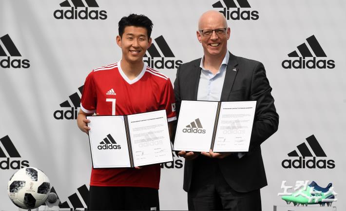 손흥민(26, 토트넘)이 15일 오후 서울 용산 아이파크몰 풋살 경기장에서 열린 아이다스 후원 연장 계약 체결 및 월드컵 진출 소감 발표 기자회견에서 스폰서십 연장 계약을 마친 뒤 아디다스 코리아 에디 닉슨 대표이사와 기념 촬영을 하고 있다.