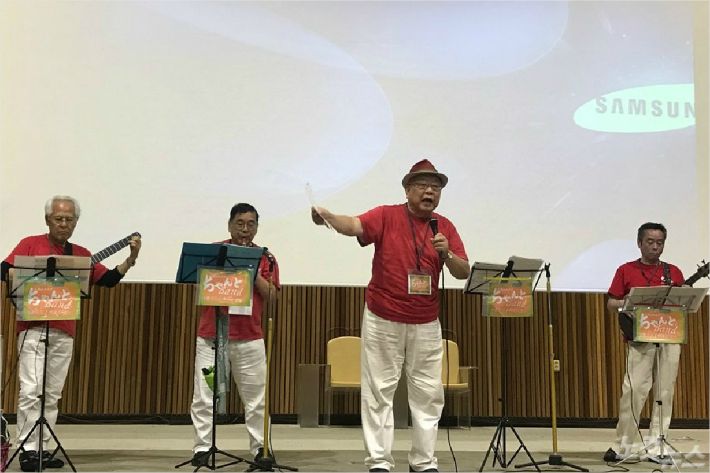 장또밴드가 학생들 앞에서 한국 인기가요를 연주하고 있다(사진=박사라 기자)