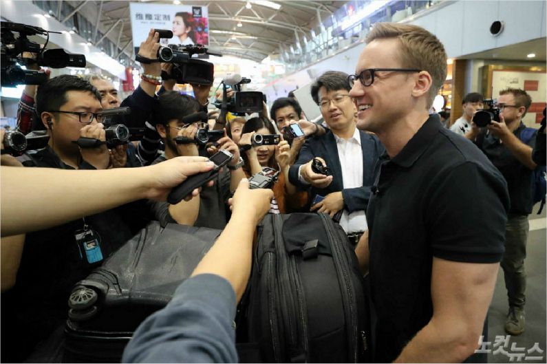 북한 풍계리 핵실험장 취재를 위해 22일 베이징(北京) 서우두 국제공항 출국장으로 들어서고 있는 서방 취재기자.(사진=김중호 베이징 특파원)