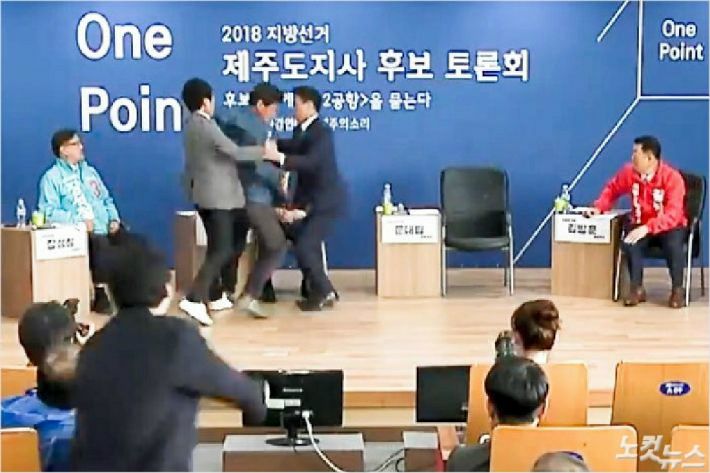지난 14일 제주 제2공항 토론회 당시 반대주민의 원희룡 후보 폭행 장면(사진=동영상 캡쳐)