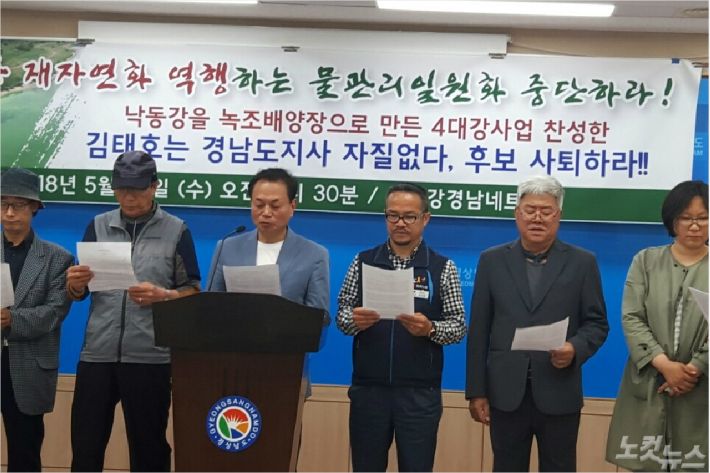 이들은 당시 김 후보가 4대강을 적극 찬성했던 언론 기사들을 소개하며 "당시 경남도의 수장이었던 김 후보의 진실을 왜곡한 해괴한 주장이 국민의 반대로 추진 동력을 잃었던 이명박 정권의 4대강 사업 추진에 동력을 제공한 것"이라고 비판했다.