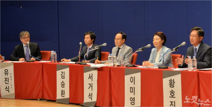 자율토론 공통주제인 '지자체 공립학원을 어떻게 보는가'에 대한 질문을 두고 후보들은 원칙적 차원에서 반대부터 현실상 수용 불가피 등 다양한 스펙트럼을 보였다.