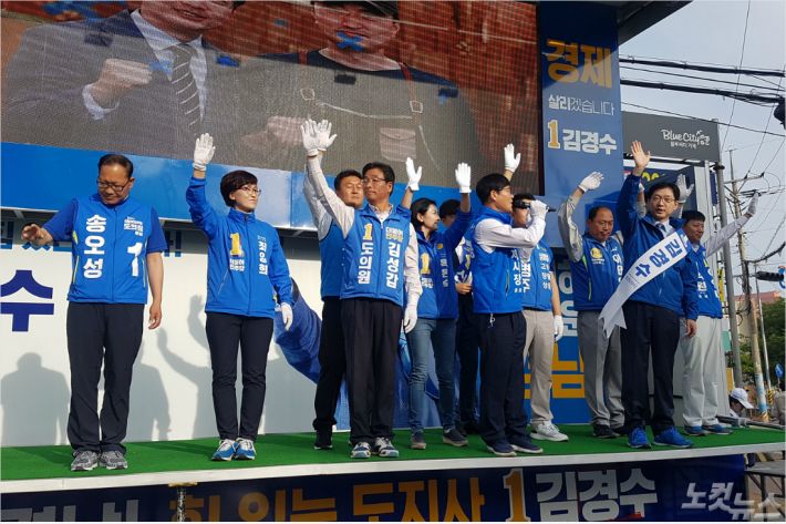 김경수 경남지사 후보와 거제 시장, 시도의원 후보들과 '원팀'으로 나서 합동 유세를 하고 있다.(사진=최호영 기자)