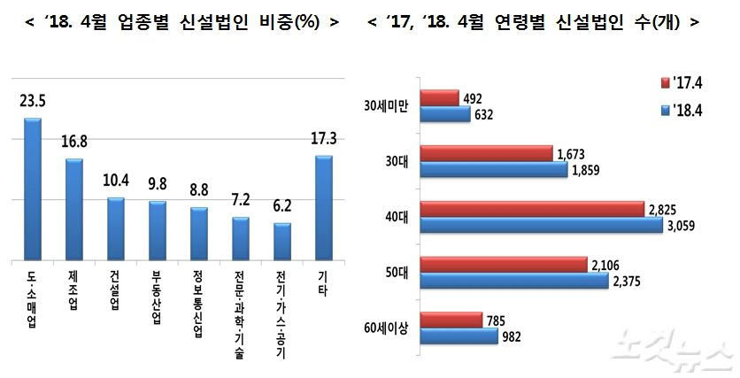 4월 신설법인을 연령별로 보면 40대(34.3%), 50대(26.7%), 30대(20.9%), 60세 이상(11.0%), 30세 미만(7.1%) 순으로 집계됐다.