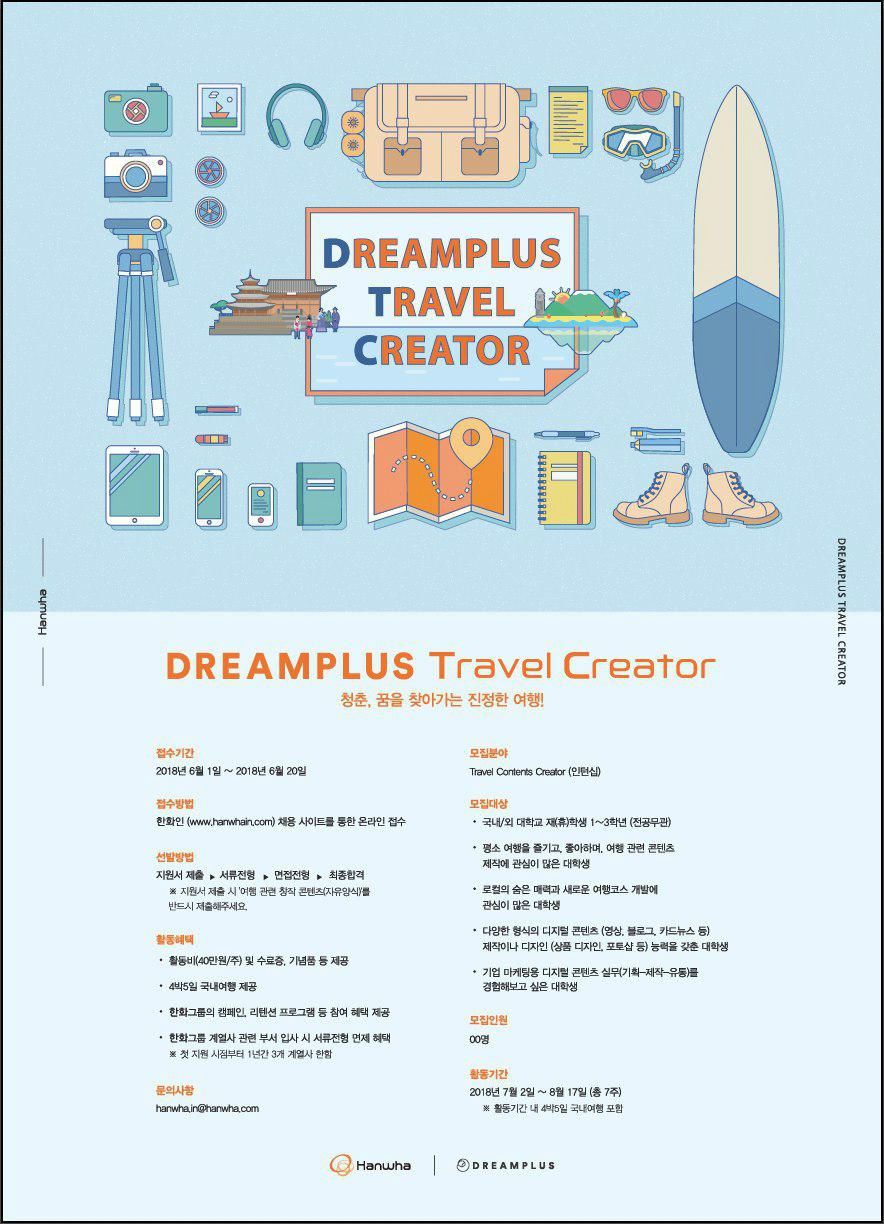 한화그룹이 대학생을 대상으로 여행 콘텐츠 크리에이터를 육성하는 7주 간의 인턴십 프로그램 '드림플러스 트래블 크리에이터를 운영한다고 4일 밝혔다.