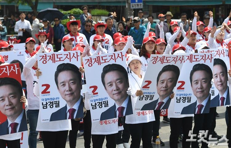 6.13 지방선거의 공식선거운동이 시작된 지난달 31일 오후 경기도 수원시 지동시장 인근에서 자유한국당 남경필 경기도지사 후보의 유세단원들이 환호하고 있다. (사진=이한형 기자)