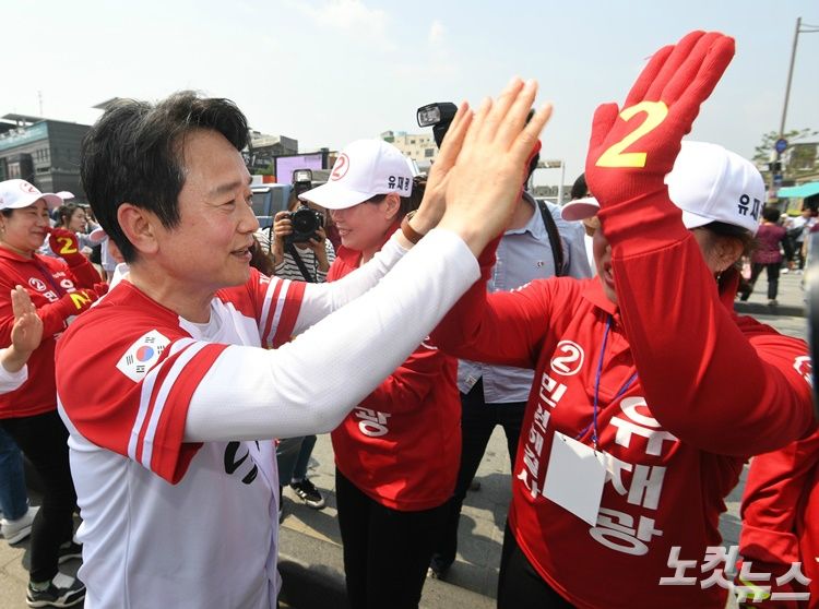 6.13 지방선거의 공식선거운동이 시작된 지난달 31일 오후 경기도 수원시 지동시장 인근에서 자유한국당 남경필 경기도지사 후보가 유세단원들과 인사를 하고 있다. (사진=이한형 기자)