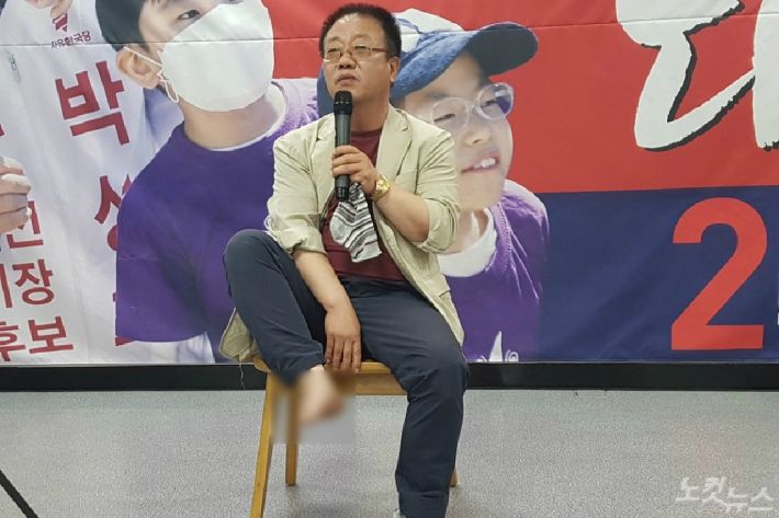 5일 대전 서구 둔산동 자유한국당 박성효 대전시장 후보 선거사무소에서 맹모 씨가 발가락 4개가 절단된 자신의 발을 공개하고 있다. (사진=고형석 기자)